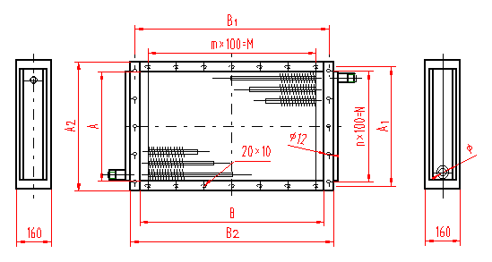(四) SRZ型散热排管基本参数表 型 号 | 散热面积(M2) | 通风净 截面积 (M2) | 热介质通过截面积 (M2) | 管排数 (排) | 螺旋翅片管根数 (根) | 连接管DN (mm) | 尺 寸 (mm) | 重量(kg) | A | A1 | A2 | B | B1 | B2 | n | N | m | M | | SRZ 5×5D | 10.13 | 0.154 | 0.0043 | 3 | 23 | 11/2" | 497 | 532 | 562 | 507 | 547 | 573 | 5 | 500 | 4 | 400 | 54 48 45 | | SRZ 5×5Z | 8.78 | 0.155 | | SRZ 5×5X | 6.13 | 0.158 | | SRZ 10×5D | 19.92 | 0.302 | 100l | 1041 | 1067 | 9 | 900 | 93 84 76 | | SRZ 10×5Z | 17.26 | 0.306 | | SRZ 10×5X | 12.22 | 0.312 | | SRZ 12×5D | 24.86 | 0.378 | 1250 | 1290 | 1316 | 12 | 1200 | 113 | | SRZ 6×6D | 15.33 | 0.231 | 0.0055 | 3 | 29 | 2" | 623 | 658 | 688 | 609 | 649 | 675 | 6 | 600 |