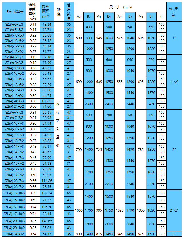 SZL(A)型换热器共有37种规格,该换热器是用无缝钢管φ21×2.5mm,铝轧翅片管外径为φ44mm,根径为φ22mm,片距为2.8mm组成。铝轧片与钢管接触紧密,散热性能好、使用可靠、耐腐蚀性、光洁、美观。 SZL(A)型换热器以蒸汽或过热水为热源,蒸汽最高使用压力14公斤/平方厘米,过热水最高使用温度为160℃,适用于空气调节系统及干燥室内的空气加热。 |